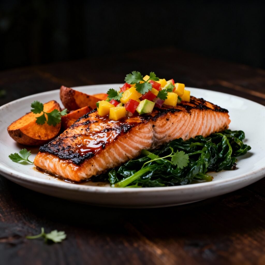 Atlantic salmon topped with fresh mango, red pepper, cilantro, and lime salsa.